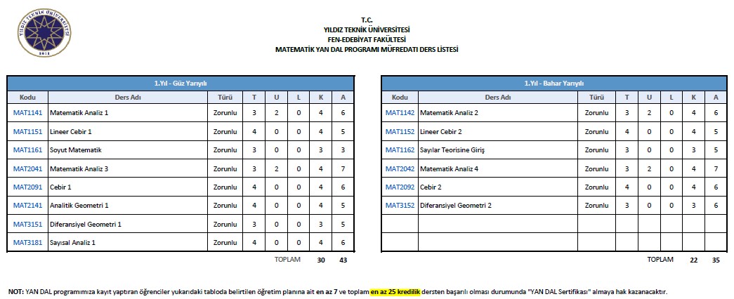 Ayrıca YAN DAL programımıza kayıt yaptıran öğrencilerin, “YTÜ Ders Eşdeğerlilik ve İntibak Esasları” doğrultusunda bu derslere eşdeğer olan dersleri almış olması durumunda aşağıdaki tabloda bulunan farklı derslerden seçim yaparak eksik olan kredisini tamamlaması gerekmektedir.