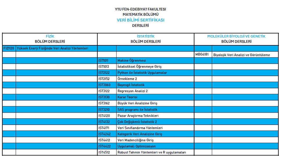 Veri Bilimi Sertifikası almak için aşağıda belirtilen derslerden 10(on) tanesinin başarıyla tamamlanması gerekmektedir. Ayrıca, MAT9000 Bitirme Çalışması, isteğe bağlı staj ve KOOP süreçlerinden en az birini de bu sertifikaya uygun bir alanda yapmaları gerekmektedir.