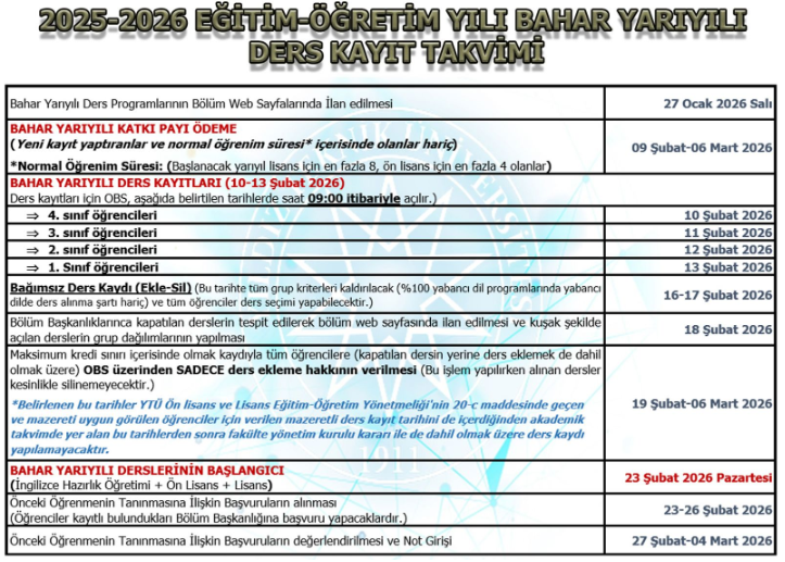 2025-2026 Eğitim-Öğretim yılı BAHAR dönemi ders kayıt işlemleri 10-13 Şubat 2026 tarihlerinde gerçekleştirilecektir. Ders kayıt takvimi aşağıda belirtilmiştir.