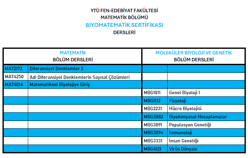 Biyomatematik Sertifikası almak için aşağıda belirtilen derslerden 9(dokuz) tanesinin başarıyla tamamlanması gerekmektedir.