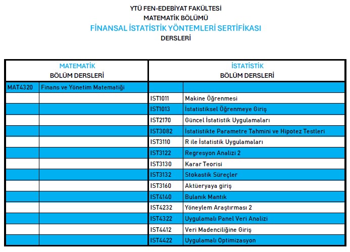 Finansal İstatistik Yöntemleri Sertifikası almak için aşağıda belirtilen derslerden 10(on) tanesinin başarıyla tamamlanması gerekmektedir.